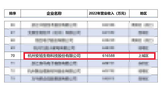 10月30日上午,杭州市工業(yè)經(jīng)濟(jì)聯(lián)合會、企業(yè)聯(lián)合會、企業(yè)家協(xié)會(簡稱市“三會”)在市政府會議中心召開了2023杭州市百強(qiáng)企業(yè)榜單發(fā)布會,會上正式發(fā)布了《2023杭州市綜合百強(qiáng)企業(yè)》。杭州安旭生物科技股份有限公司以616588萬元的營收位列第70位。